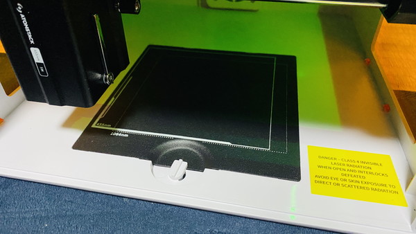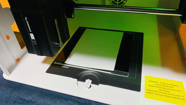 「ATOMSTACK P1」側の刻印エリアはこんな感じの白線の枠内で、パソコンのソフトウェアの範囲とこの白線のエリアが重なると思って、素材を配置するのがおすすめです。