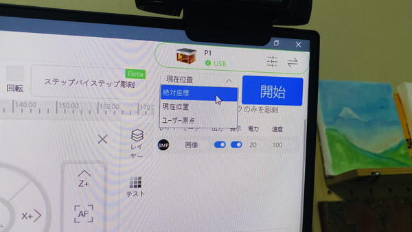 絶対座標は、パソコン上で配置した場所、「ATOMSTACK P1」本体の刻印エリアが対応しているものです。刻印したい画像データを左下に寄せて配置すれば、「ATOMSTACK P1」でも左下から刻印が始まります。