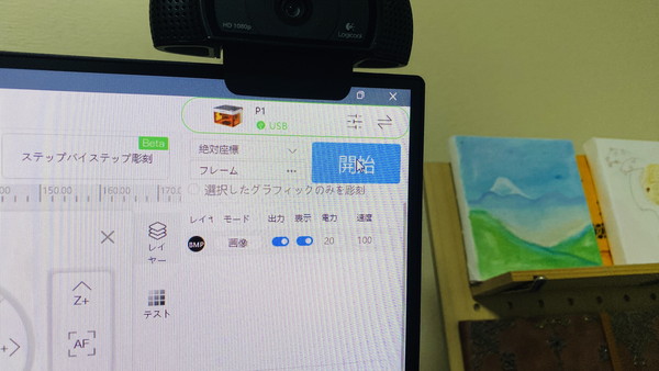 接続すると「ATOMSTACK P1」のソフトウェアの画面右上に画像のように写真と「P1」の文字が表示され、緑色の「USB」という文字なども出てきて、接続されている事がわかるようになります。