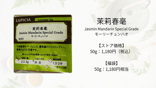毎月の定期便でよく見かける白桃系統のジャスミン茶版。量も多めでいっぱい楽しめる。