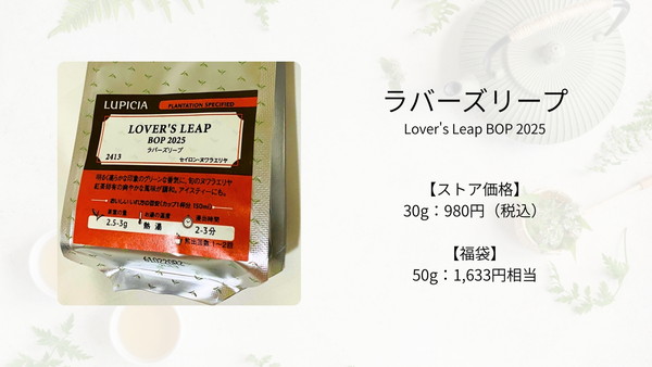 LUPICIA以外のお茶屋さんで売っている同名ブランド、類似製品の価格もそこまで大差ない物も多いため、ちょっと良いお茶の価格帯としてはムダに高いわけでも安すぎるわけでもなく、実質2倍近い価値のお茶が入っている10,000円の福袋としては十分信頼できる内容でした。