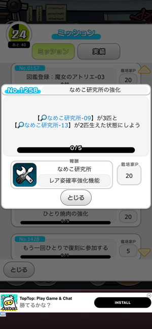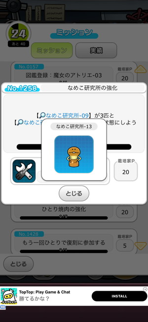 最初の栽培テーマ「なめこ研究所」では、ミッションNo.1258をクリアすればOKです。ミッションを選択すると、何を生やせばいいか表示されますので、それに従って「なめこロック」なんかも駆使しながらなめこを生やしていってください。