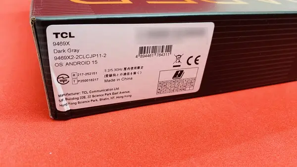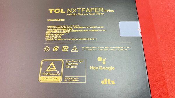 「TCL NXTPAPER 11 Plus」の外箱の裏面には小さな文字で説明や注意事項が書かれており「Hey Google」や「dts」の文字もあります。
