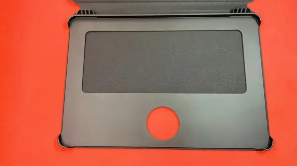 ケースの上部に、本体のカメラの位置に合わせた丸い穴が空いています。ケースそのものは手帳型のようになっているため、タッチパネル側も傷や衝撃から守れます。