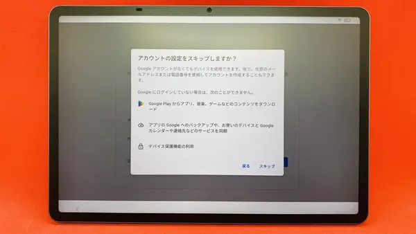 スキップしようとすると「画面ロックをスキップしますか?」と表示されるので、「無視してスキップ」を選んで次に進みます。