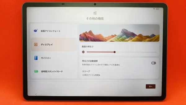ディスプレーの明るさや自動調節のON、OFFのほか、スリープ状態になるまでの時間も変更できますが、まずは使ってみてから少しずつ快適な設定に変更・調整するのがおすすめです。