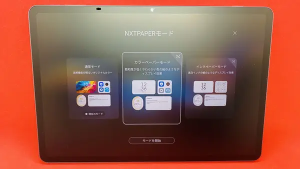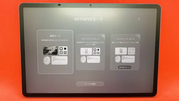 元の通常モードに戻すには、同じく「NXTPAPER KEY」ボタンを押して、通常モードを選び「モードを開始」を選びます。