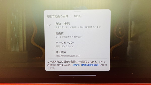 YouTubeで動画再生してみた感じでは、画質は接続している回線によって変動があり、自動になっていれば1080pでの動画再生が可能です。データセーバーをONにしても480pか360pくらいにしかならないようで、それほどひどい画質だとは思えないきれいさで動画を楽しめました。