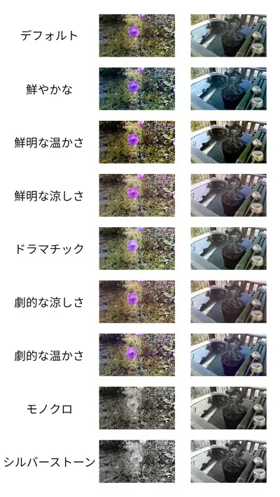 各フィルターで撮影した画像を並べてみました。日光のあたり具合や水面の反射、水の色、花の色などもフィルターでかなり変化するので、好みのフィルターを使ったり、元のデフォルトの色合いに近くなるものを使用しましょう。